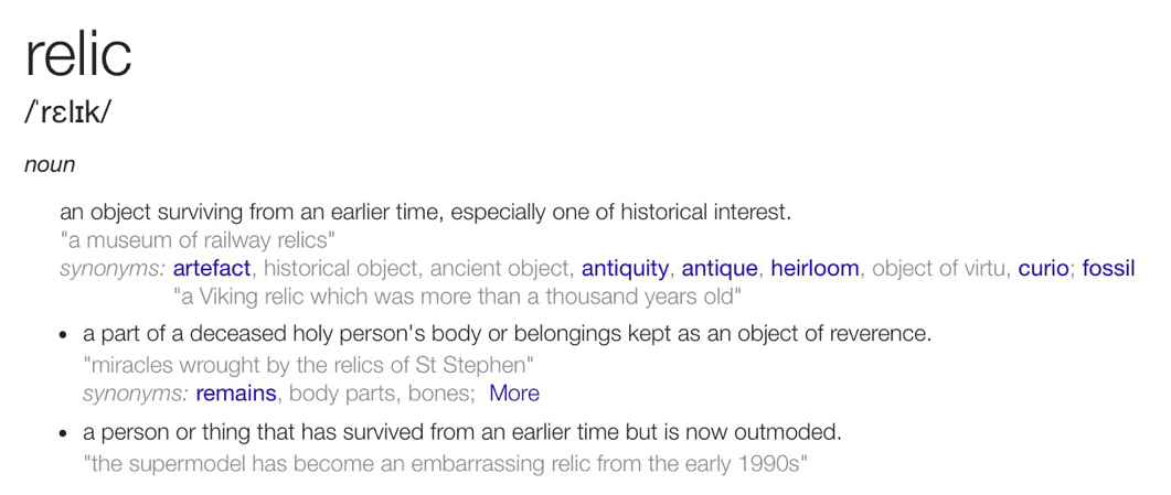 A relic is an object that has survived for many years and, in a religious context, has a significance so great that they are protective and can even perform miracles. This is an interesting notion of almost magical powers, so I naturally wished to find out more.